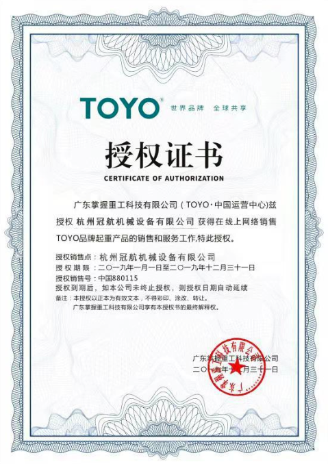 杭州冠航機(jī)械設(shè)備有限公司為TOYO中國(guó)運(yùn)營(yíng)中心授權(quán)的線上網(wǎng)絡(luò)銷售商。